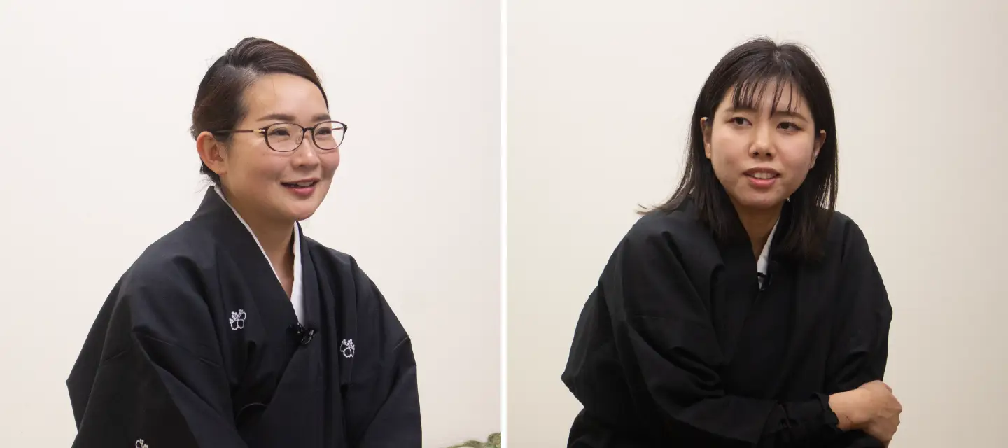 淡路人形座 それぞれの役割吉田千紅(写真右)「2025年春、座員に役職がつきました。まず『失敗してもまた次がんばろう!と励まし合える人に任せたい』という、株式会社うずのくに南あわじ宮地勇次社長の意向で私が副支配人に」