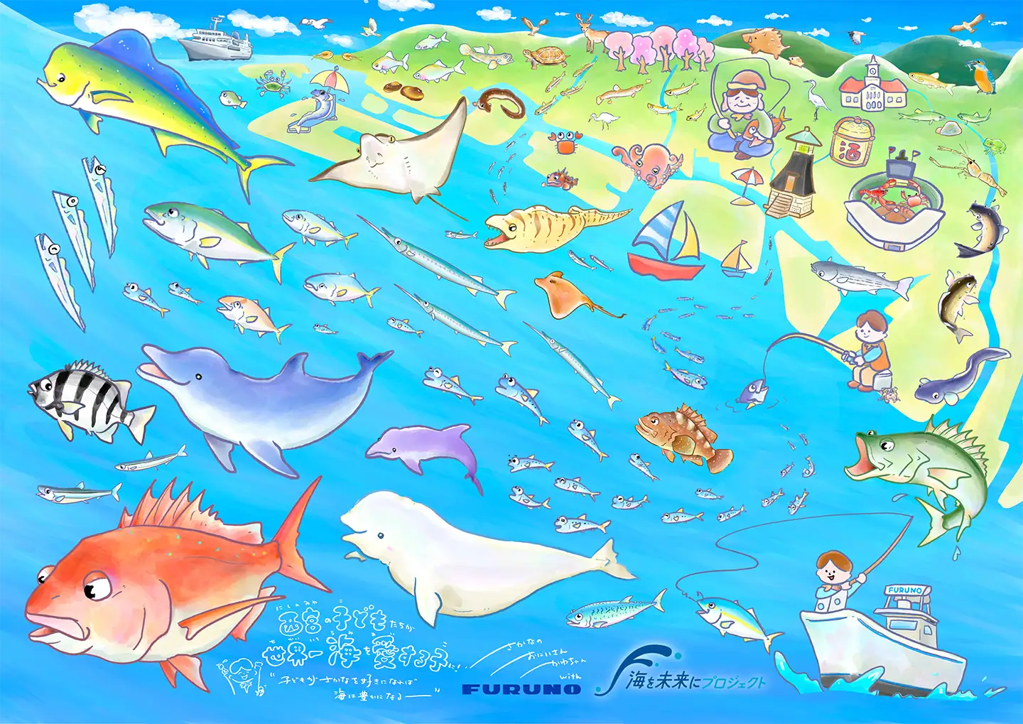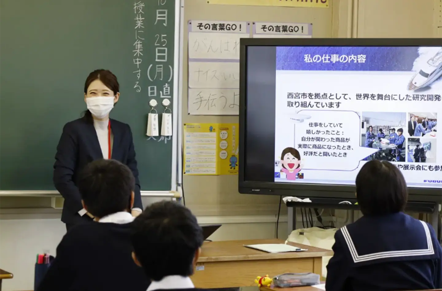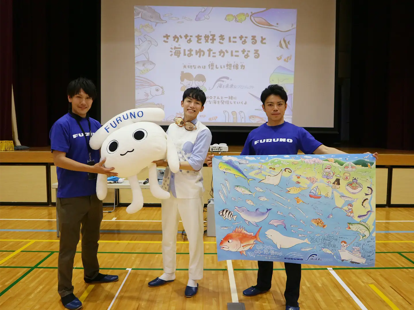 これはかわちゃんがゲストとして小学校に招かれた特別授業ではない。西宮に本社を置く古野電気(以下、フルノ)が2024年から西宮市の小学校で開催している環境学習イベントだ。知識を教えるというよりも、子どもたちに楽しんでもらうことや、子どもたちとの掛け合いを積極的に取り入れるなど、フルノの公式アンバサダーかわちゃんと工夫を凝らす。「西宮の子どもたちを日本一の海好き・魚好きに」することを目指しつつ、フルノ社員たち自身も楽しみながら、子どもたちが海や魚のことを学べる場をつくっている。
