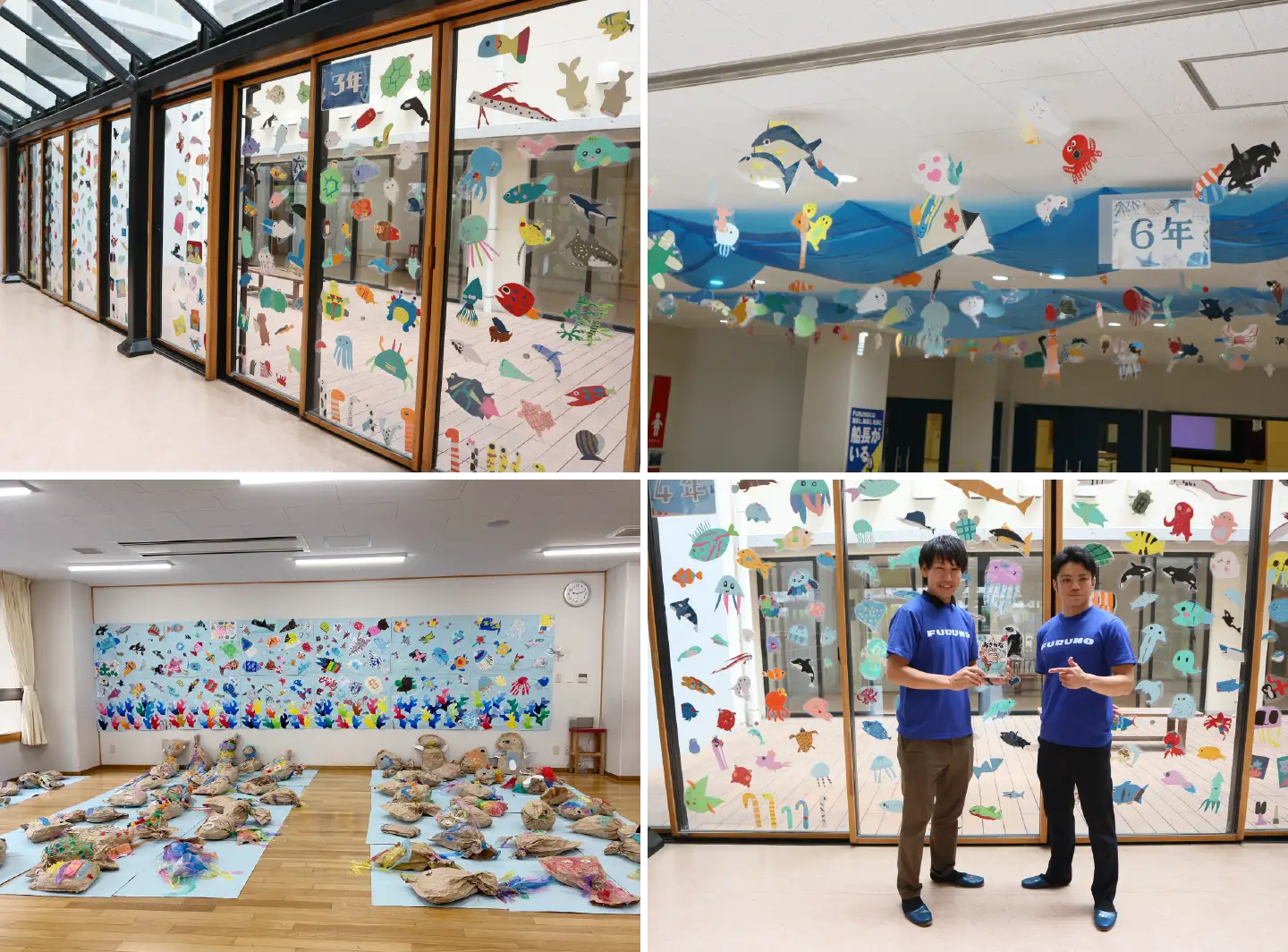 西宮市立高木北小学校が水族館に!?「1~6年生のどの作品も本当に個性的で、みんなの想像力に感動しました」と、イベント担当の加島さん 「イベント当日、校内の廊下やガラス壁、天井などあちこちに児童たちの「海の生き物」の作品が展示されていて驚きました。事前に図工の先生が授業に取り入れてくださったとのこと。国語や外国語の授業でも海や魚の学びを取り入れ、栄養士の先生は「今日の魚はどの栄養素?」と給食の献立に結びつけた自作のポスターを掲示し…。イベント前後の時間も学びにつなげようという先生方の熱い想いにグッときました。」経営企画部 加島辰哉さん