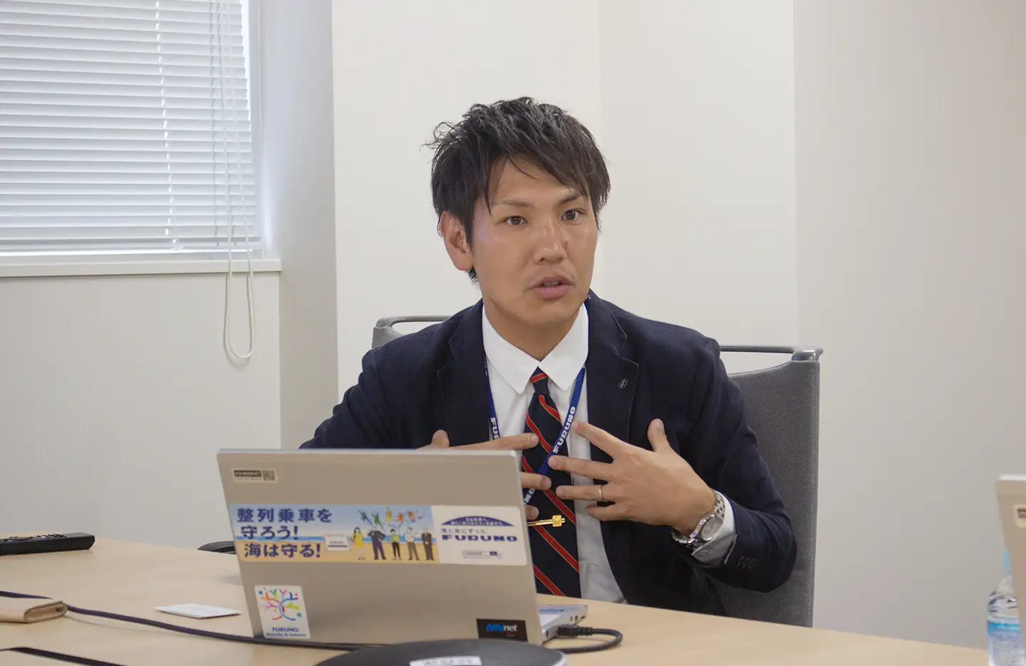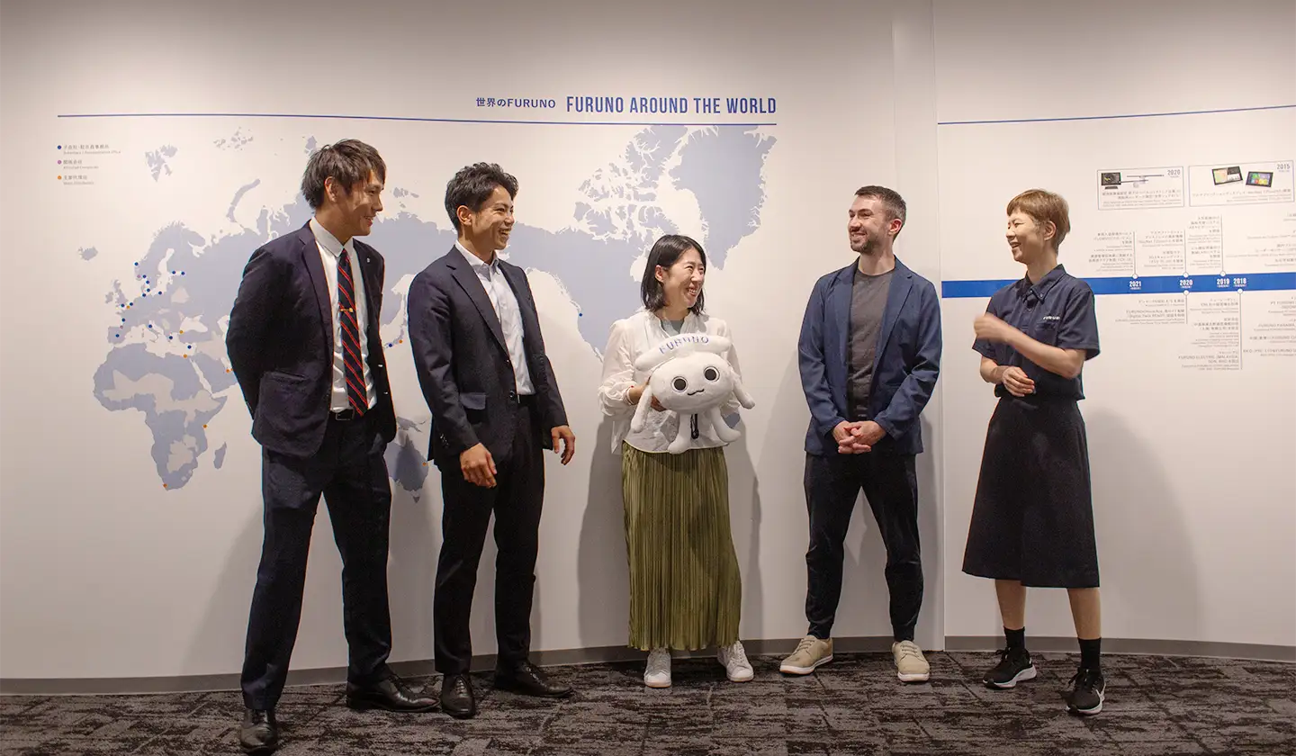 王微さん(以下、王):私たちは、物事をグローバル(世界規模)で考え、ローカル(地域)をベースに行動するという「Think globally, Act locally」の姿勢を大切にしています。本社のある西宮だけでなく、港がある日本、世界の各拠点がそれぞれの地域とつながり、地元の人たちと信頼関係を築いてきました。それは、90年近く引き継がれている顧客に寄り添う「浜営業」スタイル、創業時から変わらない私たちのDNAみたいなもの。とにかく現場に出向き、漁師さんに寄り添い、困りごとがあれば修理や点検、相談対応に駆け付けます。日々の対話の中から製品開発のヒントも得てきました。顧客と機器メーカーの社員という関係を越えて、海の仲間のように接してくれる漁師さんも少なくありません。私は前職もグローバル企業に勤務していましたが、フルノのお客さまへの寄り添い力はとても強い。海外支社の社員も同じで、皆がお客さま第一で動いています。