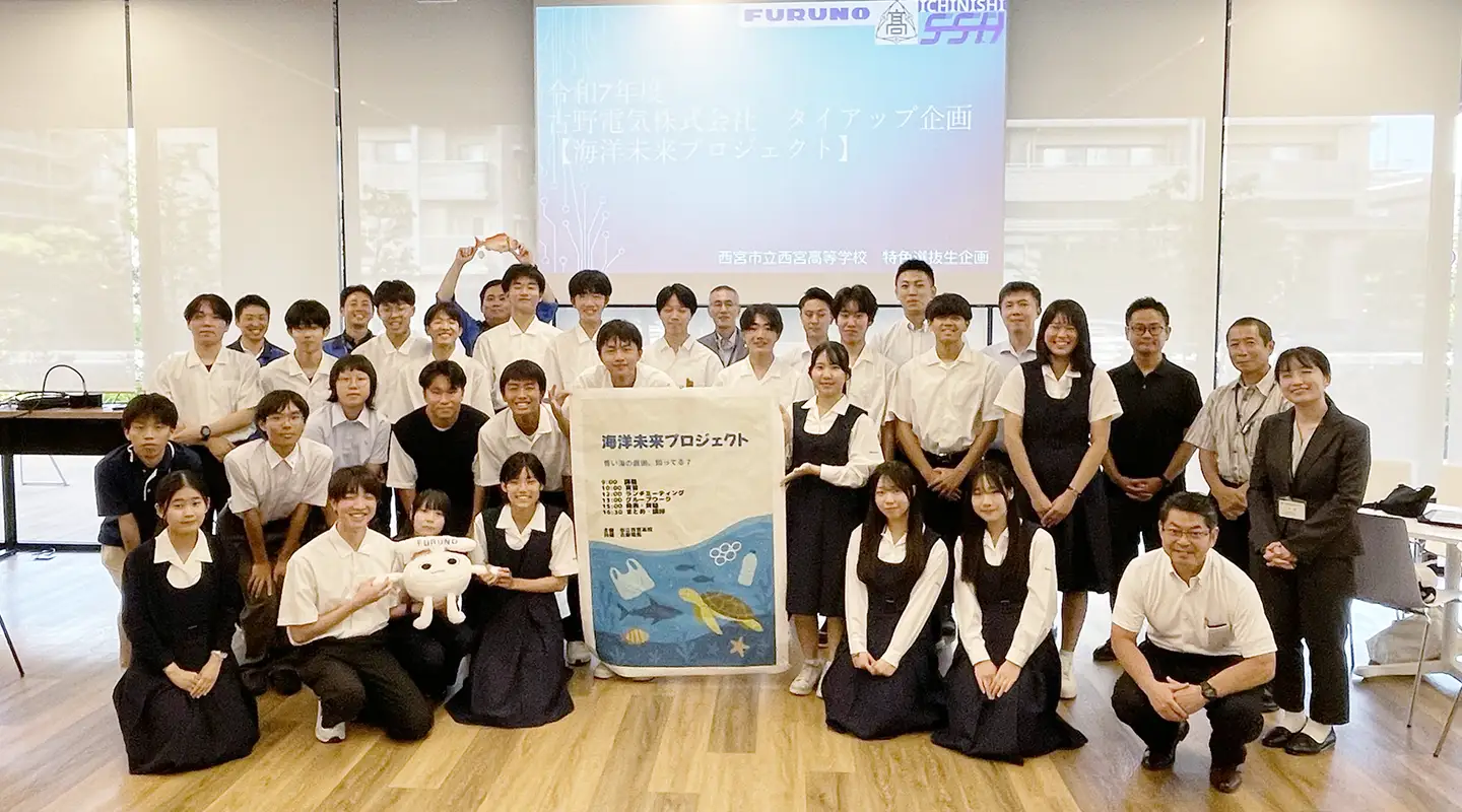 清水美也子さん(以下、清水):市内の高校の先生からの電話です。「理科教員の研修会のために会議室を借りたい」とかかってきたんです。当社はB to B企業なので、一般の人との接点がほぼなく、西宮在住者への認知度調査でも、年配の方は知っていても、若い人にはほとんど知られていなかった。ちょうどその頃、もっとフルノのことを知ってほしいし地域とのつながりを増やしたい、学生たちにも開かれた会社になりたい、出前授業みたいに自分たちが出向いていけばいいんじゃないか、などの議論が社内に起こっていたタイミングだったので、地域のニーズの一つだと思い、喜んで引き受けました。弊社をご存知なかった先生方も、会社説明のあと展示室を見学され、フルノの技術に関心を寄せてくれました。その後、市内2校から、新設学科の探究学習のサポートと、文部科学省の「スーパーサイエンスハイスクール」にかかる運営指導委員のお話をいただきました。