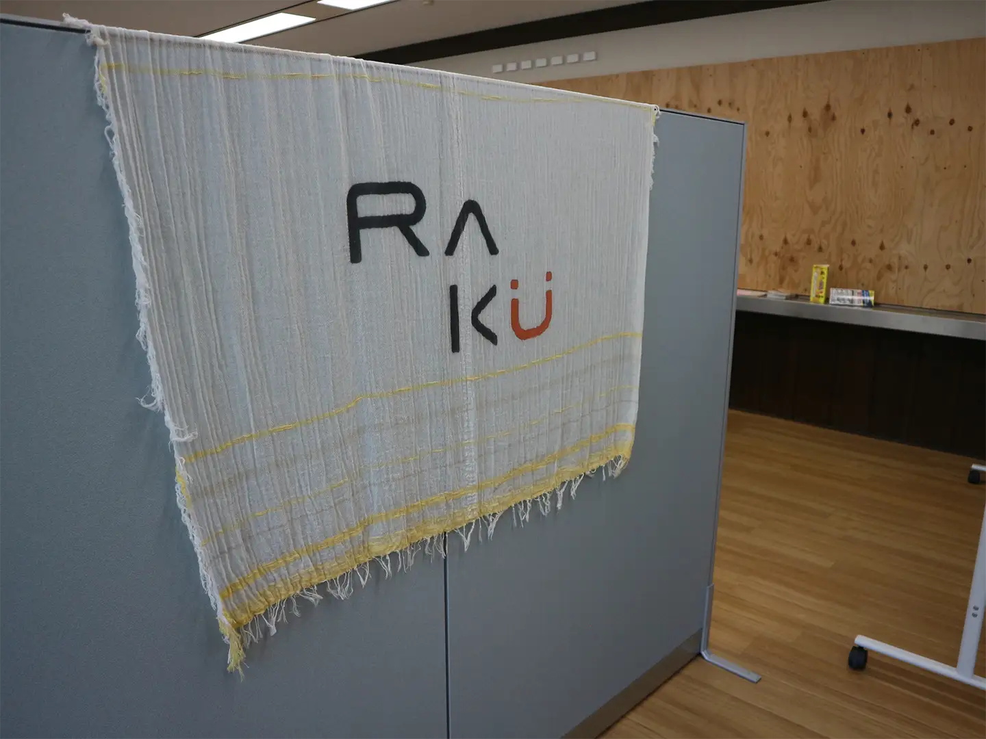 「地域商社RAKU」社名の意味は?事務所入り口に掲げる社名は、播州布に印刷 「『RAKU』の由来は大きく3つ。