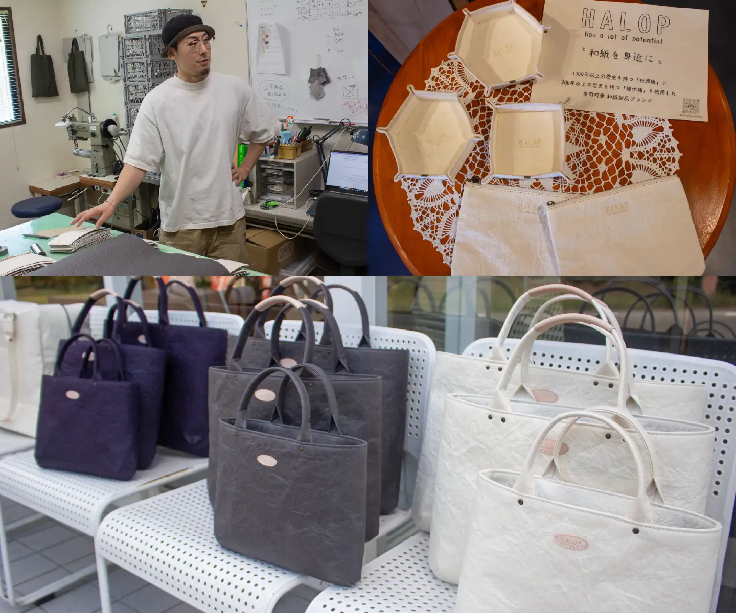 杉原紙の和紙製品ブランド「HALOP」(左上)作業場でお話を伺った橘大地さん(右上・下)杉原紙と播州織を組み合わせた雑貨ブランド「HALOP」の商品 営業担当の竹安祐貴さん「デザインが大好きなのですが、伝統の和紙や織物を後世に残したいという地域への想いも、皆さんにぜひ知ってもらいたいです」