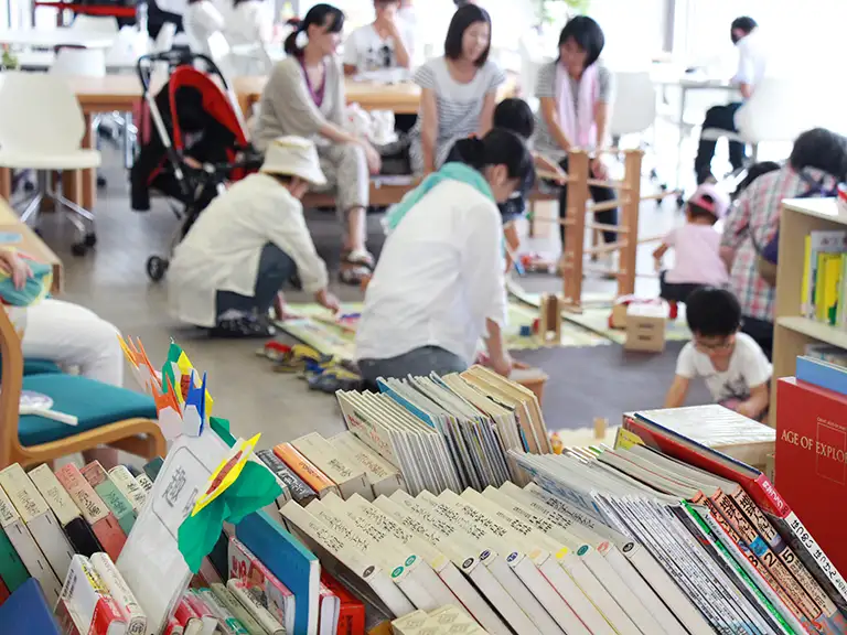 柏木さんにお話を伺っていた「かわのまちリビング」のフロアは、一部吹き抜けになっていて、階下にシミンズシーズが運営する「かわのまちほいくえん」の様子が見える。