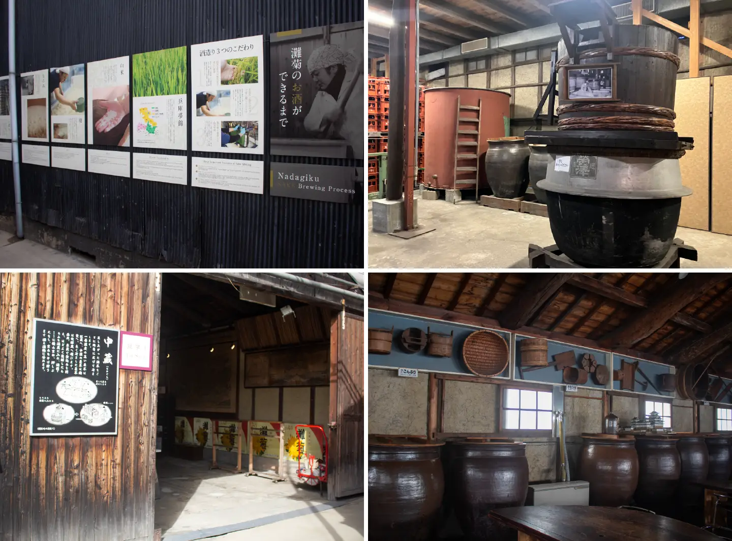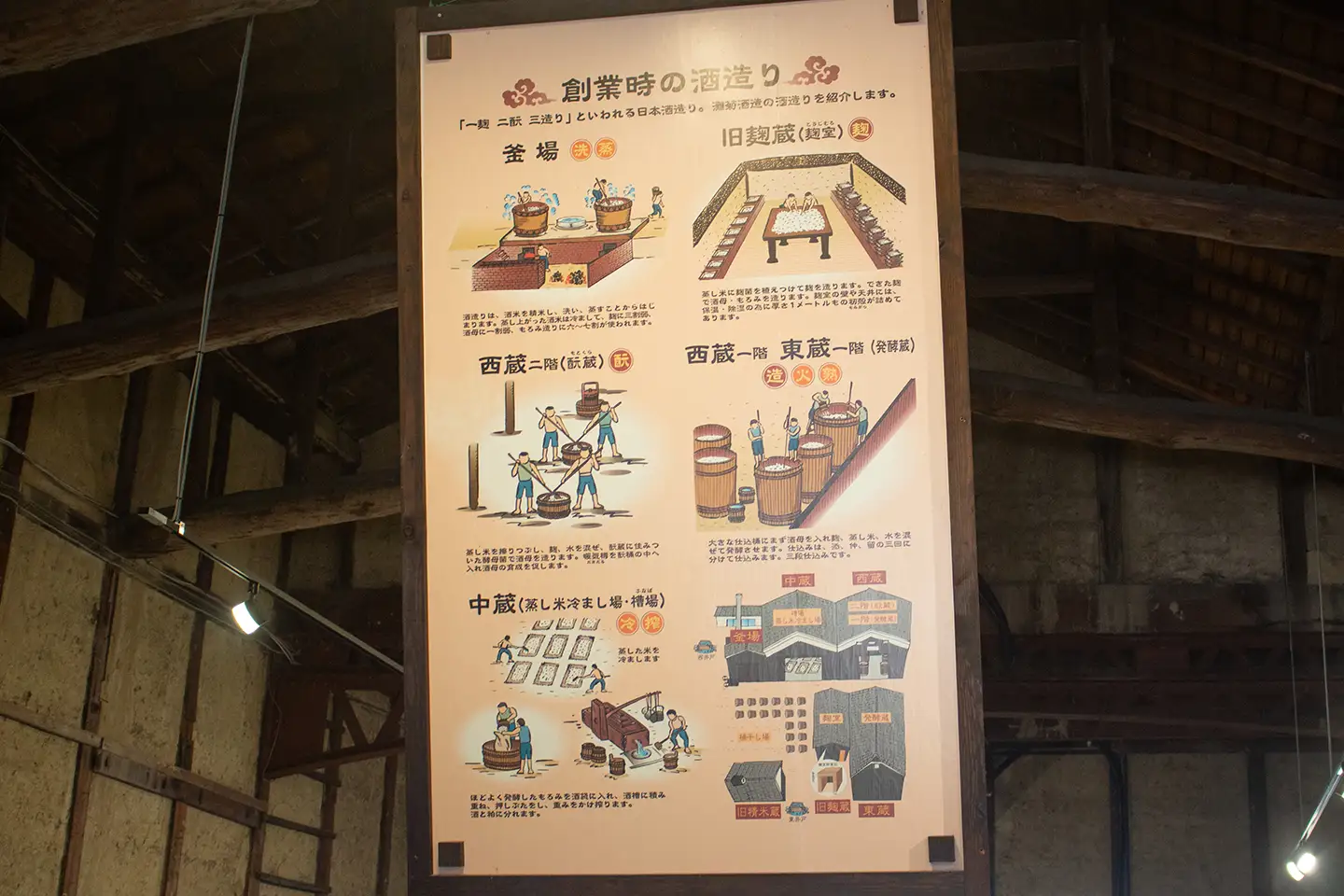 明治時代の木造酒蔵をリニューアルし、酒造りの工程を解説したパネルや昔使われていた道具の展示などをしている