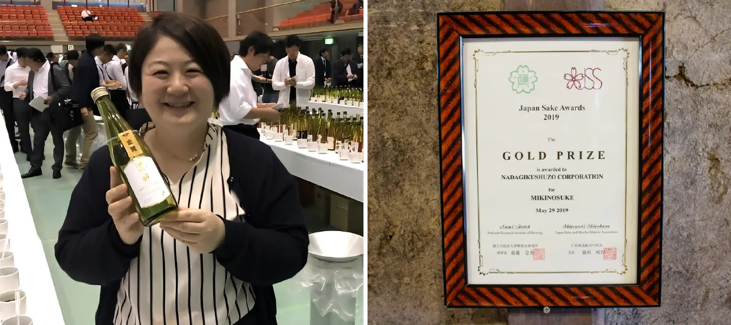 2019年に全国新酒鑑評会で初めて金賞を受賞したときの会場にて(写真左)。表彰状は酒蔵ミュージアム内に展示している(同右)