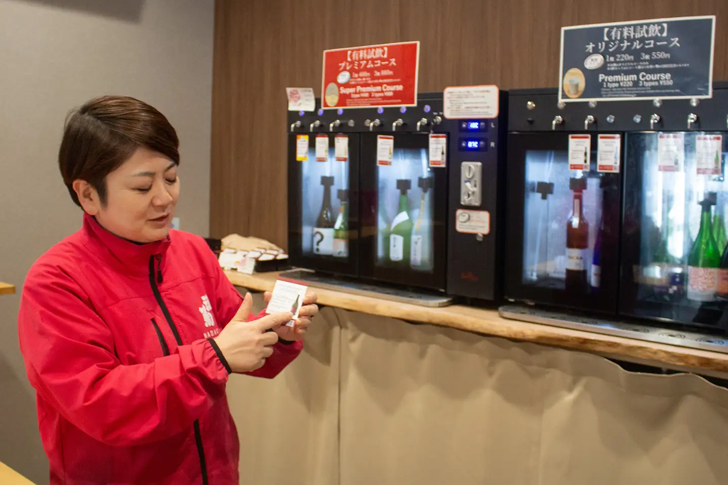 英語のできるスタッフがいない場合でも、外国人のお客様が困らないよう、試飲マシンも商品説明カードなどもすべて英語を併記している