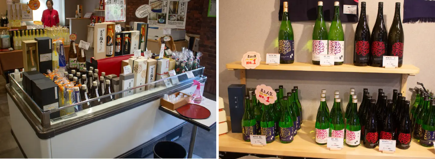 直売所には、看板商品「灘菊」シリーズのほか、季節限定品やゆず酒など多彩な品ぞろえ。悩んだときはピンク色の法被を着たスタッフに気軽に相談できる