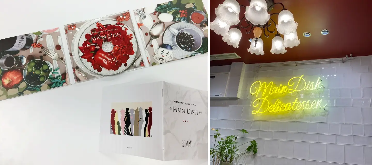 「MAINDISH」が、ステージとお店をつないだ。レマさんがトータルプロデュースしたCD「MAINDISH」のジャケットと、現在のお店の壁に飾られたネオンサイン。 20代の頃、ふと「MAINDISH」という言葉が浮かんで。当時、楽曲もカバーデザインもすべて自分でプロデュースするCDアルバムを作ってみたかったんです。そこで、レストランでフルコースを食べるようなコンセプトのMAINDISHというアルバムを制作しました。そこから、レストランを舞台にしたステージショーができあがったんです。まさか、本当にカフェを開業することになるとは思ってもみなかったですね。