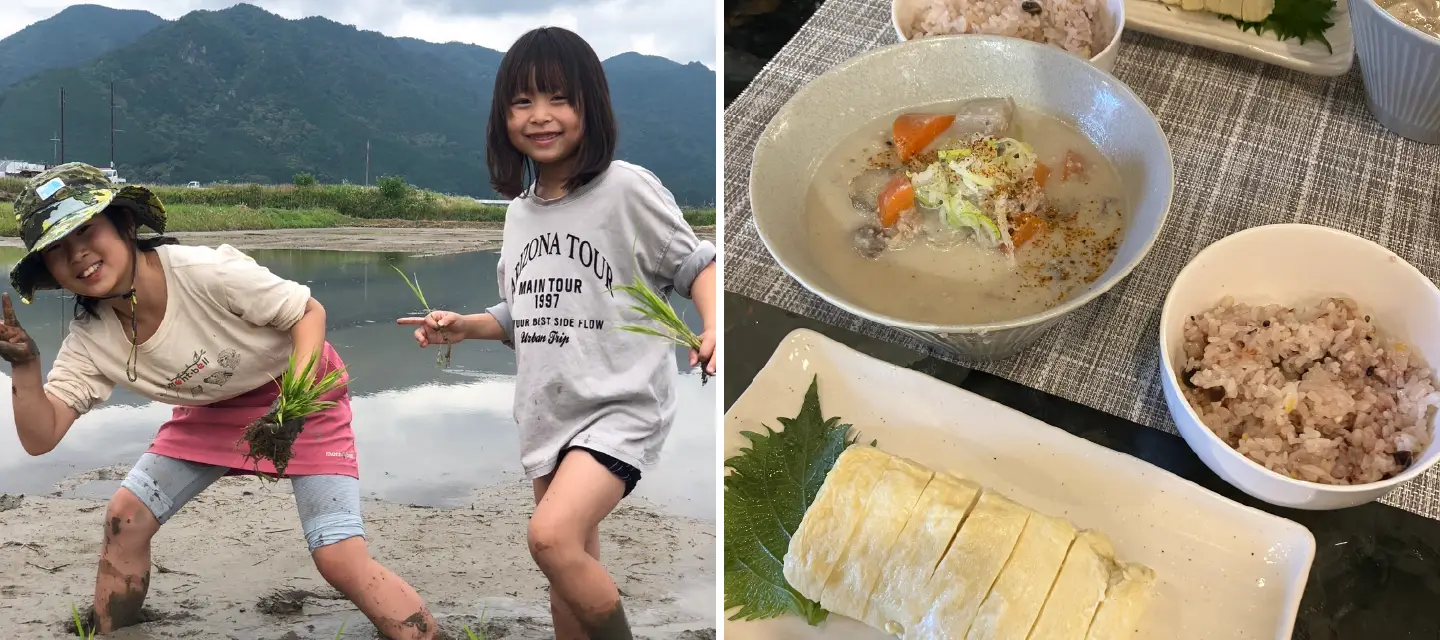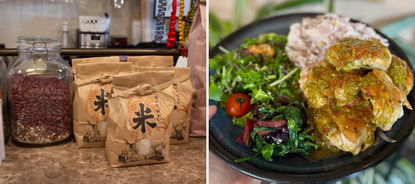 丹波のお米に、西宮の平飼い卵丹波や西宮など、お店を通して、農家さんたちとのつながりも増えている。 娘が農業体験させてもらった丹波の農家さんのお米を店頭で販売しています。ランチで提供しているだし巻き卵は、西宮・山口町のムギマルファームさんの平飼いの卵を使用。「こんな方がいるよ」と、別の農家さん伝えで教えてもらってご縁ができました。食を大事にしたいので、微力だけど、少しでも近隣農家さんの力になれたらと思っています。