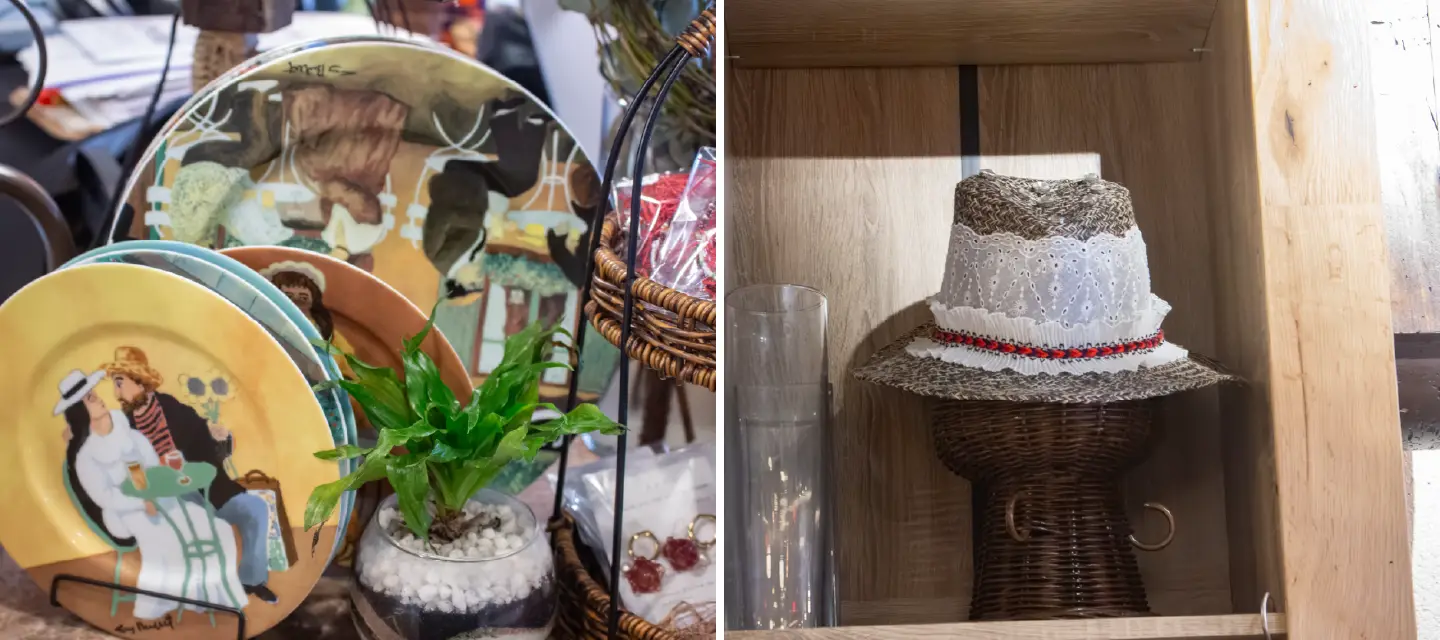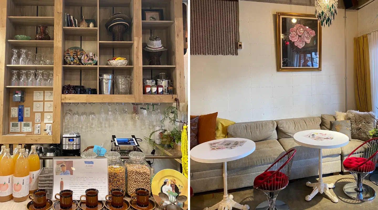 改めて店内を見渡すと、昭和の純喫茶を思わせるガラスの照明に、キャバレーのようなミラーボール。個性的な手縫いの帽子や、南米のイラストが描かれたお皿が並んでいる。服やアクセサリーのギャラリーコーナーもあれば、丹波のお米も販売されている。「どこを切り取っても大好きと思えるもの」とレマさんは話す。