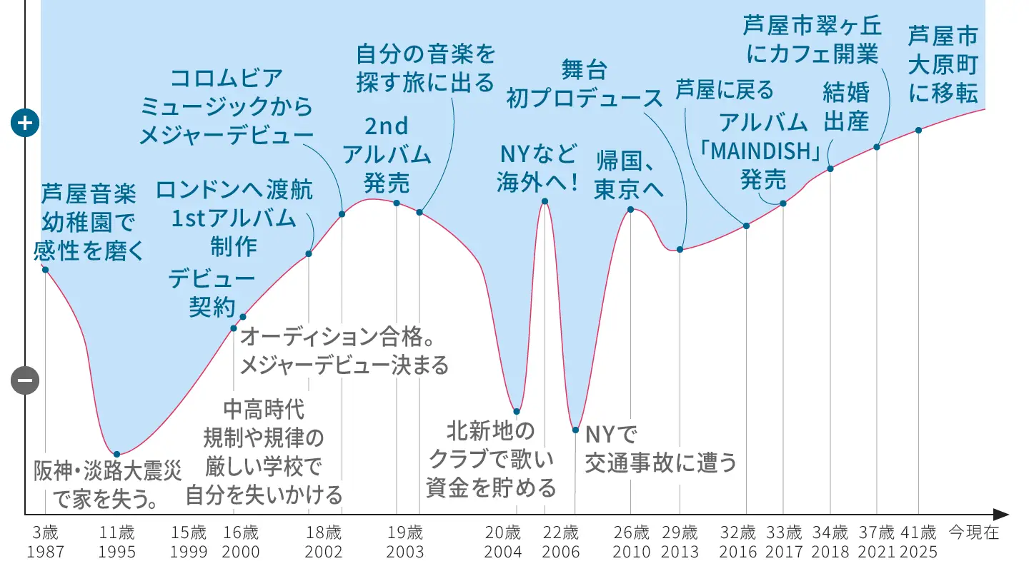 芦屋市出身。歌手、舞台プロデューサー。高校卒業と同時にロンドンへ渡り、10代後半から海外クリエイターとの楽曲制作やライブ活動を重ねる。帰国後、コロムビアミュージックエンタテインメントよりメジャーデビュー。2013年より、レストランを舞台に音楽・ダンス・舞台演出を総合的にプロデュースするエンターテインメントショー「MAINDISH」を公演。音楽の枠にとどまらない表現を追求してきた。2016年に地元芦屋へ拠点を戻す。2021年には文化・芸術と食を掛け合わせたカフェ「MAINDISH DELICATESSEN」をクラウドファンディングで205人からの支援を得て開業。現在は5人のママスタッフとともに運営しながら、地域のアーティストをつなぐ活動やイベント、ワークショップを開催。芦屋と丹波地方をつなぐ取り組みにも挑戦している。