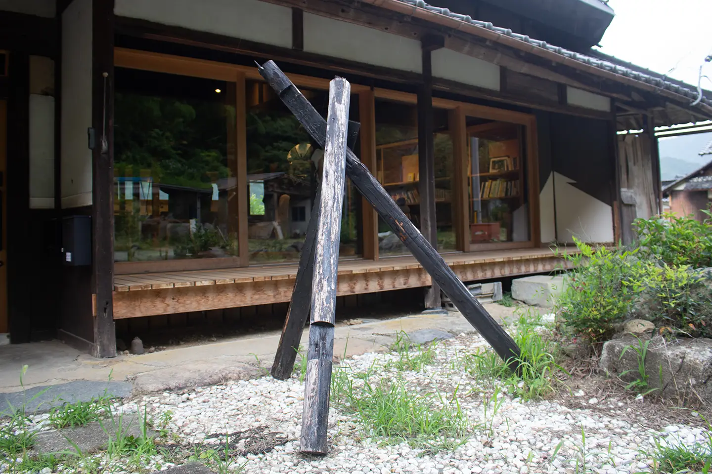 古民家をリノベーションしたときに出た古材を使い、古いものに新たな命を吹き込んだ、まさに「Tamba Creative HUB」を象徴する作品です。エントランスに入ると、左手の土壁の一部が崩れ落ちているのが「破壊」。作者不詳です。
