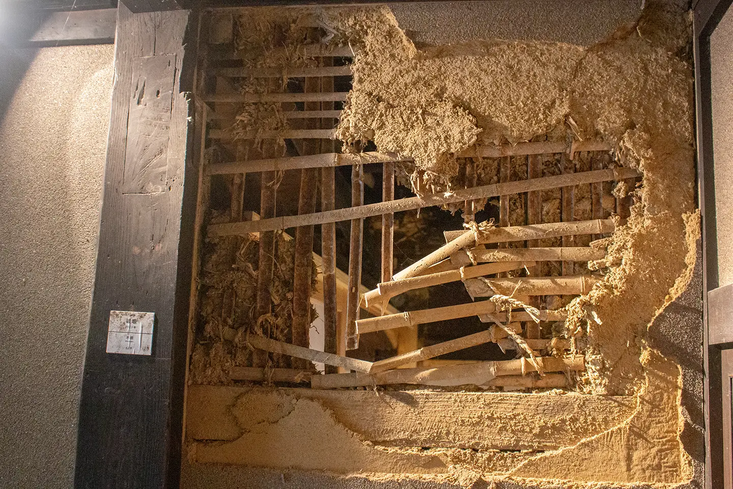 古民家再生ワークショップ中、参加者の方がうっかり壊す予定のない壁までハンマーでたたき壊してしまって…まあ、これも味かなと。横にタイトル板をつけたら、深い意味がありそうに見えるから不思議ですよね(笑)」